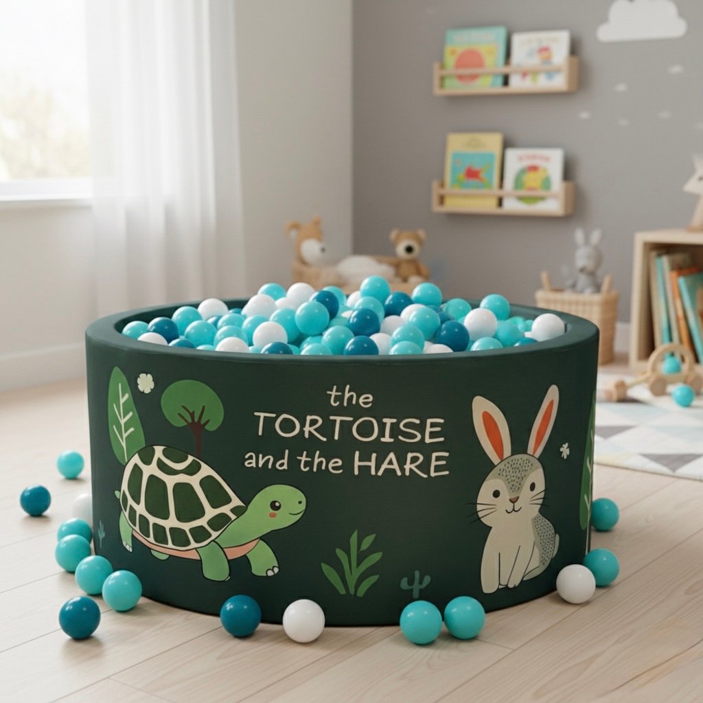 Turn playtime into a magical story with the Jaciks Forest Green Tortoise & Hare Story Round Ball Pit. Inspired by the timeless fable, this customized ball pit blends fun, learning, and style in one safe play space. Made with soft milk fiber fabric and high-density foam walls, it ensures comfort and safety for toddlers while looking stylish in any playroom or nursery. The bright green base is decorated with playful tortoise and hare illustrations, making it both educational and entertaining. The ball pit comes complete with a mix of soft, non-toxic play balls in forest green, turquoise and white, designed to stimulate sensory play and early motor development. Perfect for birthdays, gifts, or everyday indoor fun, this pit is a must-have for active little explorers. Add extra fun to your child’s playroom with the Jaciks Mustard Cute Bee Stripes Round Ball Pit with 200 Balls, designed for safe, colorful, and engaging play.